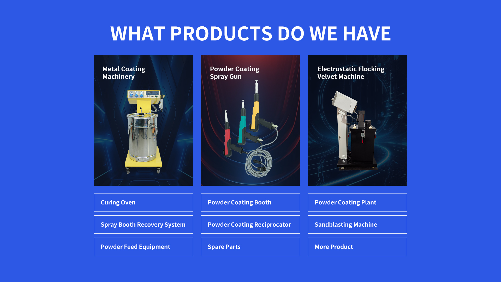 Powder Coating Machines apply dry powder to surfaces electrostatically, followed by curing under heat. This process ensures adhesion and corrosion resistance. Common projects include coating automotive parts, household appliances, and industrial tools.